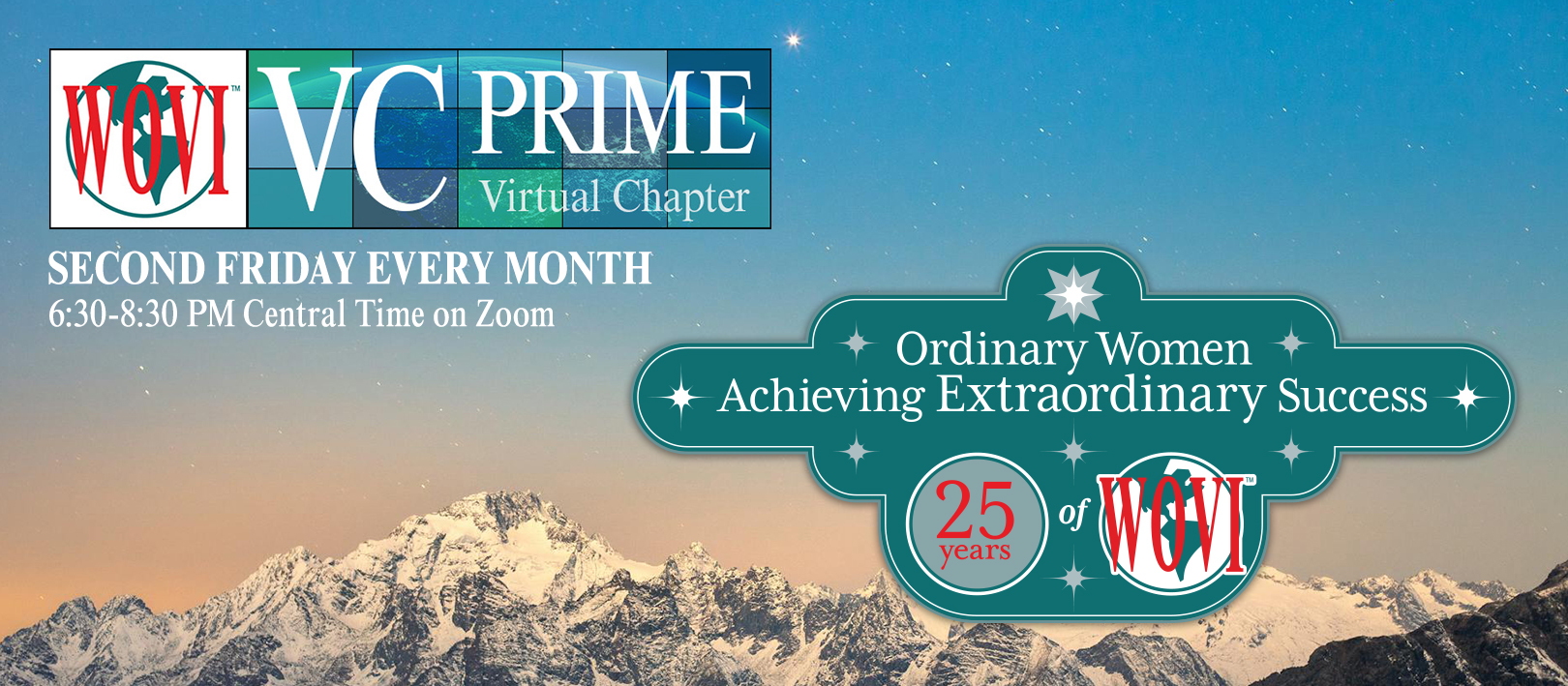 WOVI VC Prime meets on the Second Friday of each month, 6:30-8:30 PM Central Time (5:30 PM Mountain Time, 7:30 PM Eastern Time)